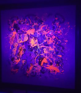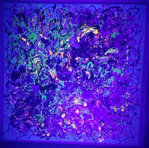 Todas las obras tienen una doble visión, ya que con luz natural presentan un aspecto y con luz ultravioleta se ven otros tonos que subyacen dentro de la obra. La técnica es acrílico con flúor con muchas texturas y materia, por eso dentro de la obra aparecen nuevas composiciones y nuevos colores al iluminar con luz ultravioleta.
