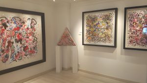 Entre las obras presentadas están una pieza de gran formato de 150 x 150 cm, dos de 100 x 100 cm y una original y versátil obra triangular que se puede poner tanto en peana, como en pared. Todas ellas con la doble visión.